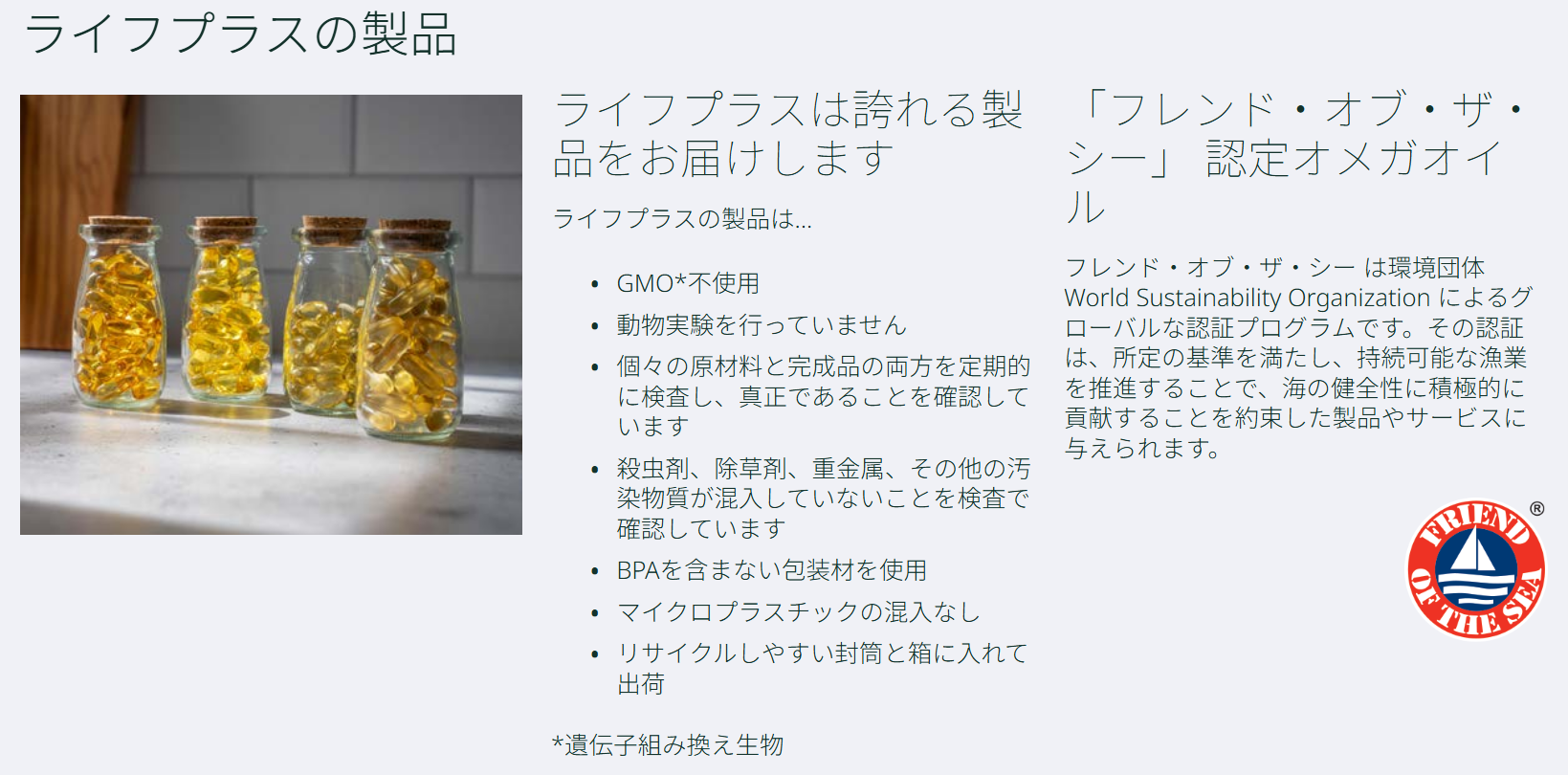 アメリカでは、FDA(米国食品医薬品局)が安全性を監督。DSHEA法により効果表示には科学的根拠が必要です。さらにライフプラスは製品詳細データを公開し、成分や製造方法、使用法まで誰にでもわかりやすく提示しています。